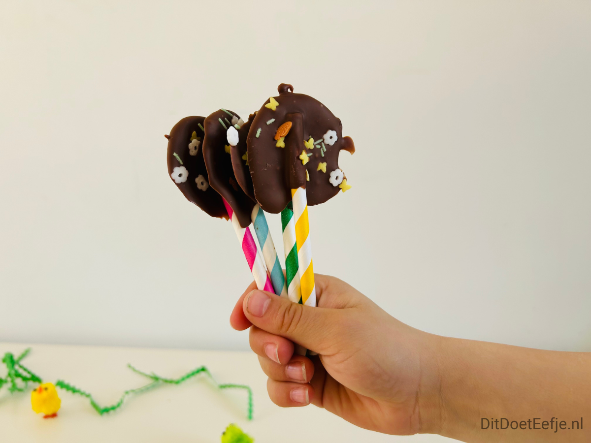 Met een paar lollystokjes (of rietjes) en gesmolten chocolade creëer je in een handomdraai deze prachtige chocolade lolly’s. Versier ze met je favoriete paasstrooisels en zet ze even in de koelkast. Ze zien er bijna te mooi uit om op te eten… bijna!