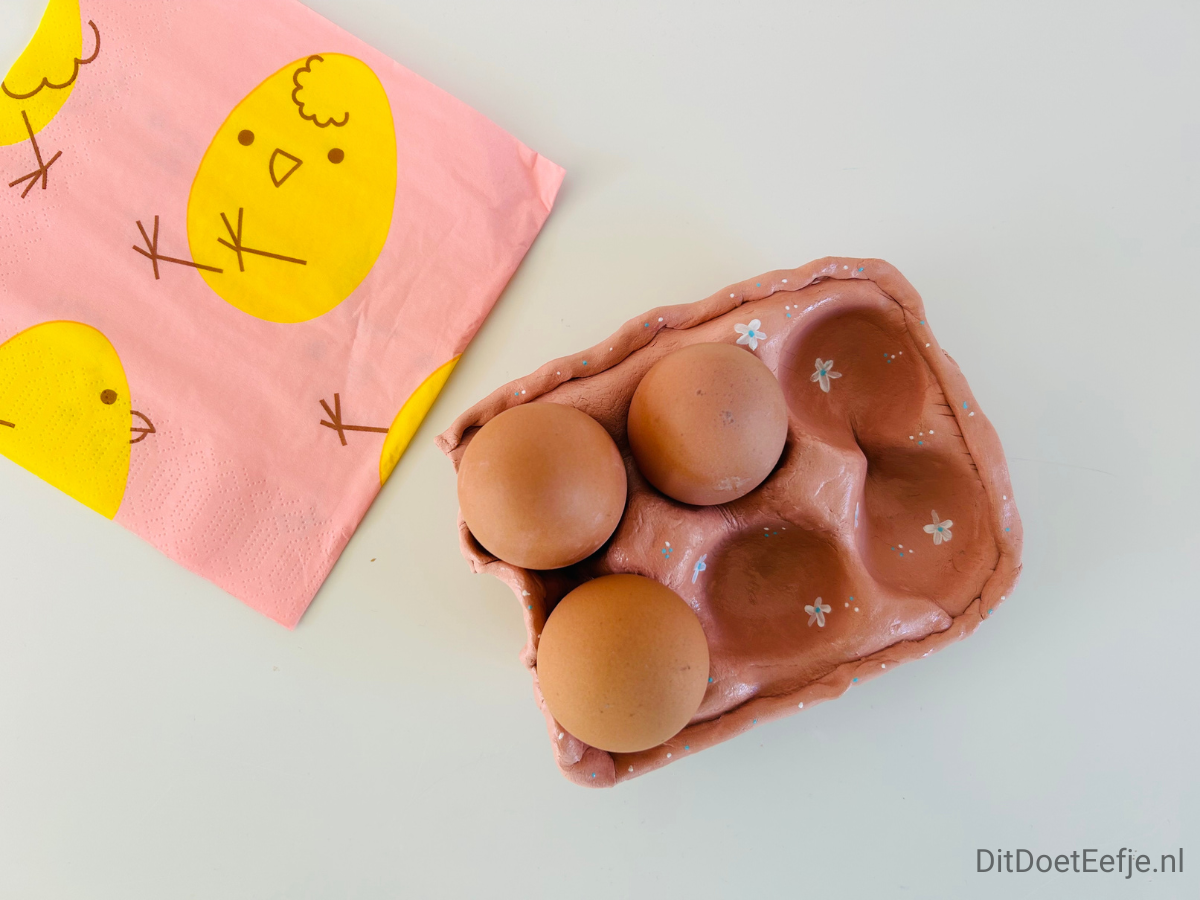 Je kunt een ei gebruiken om de klei netjes in de vorm te krijgen en met wat water werk je eventuele scheurtjes weg.