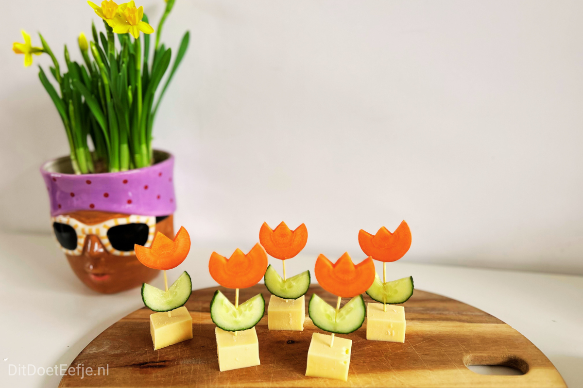 Met kaas, komkommer en wortel maak je in een handomdraai een eetbare tulp!
